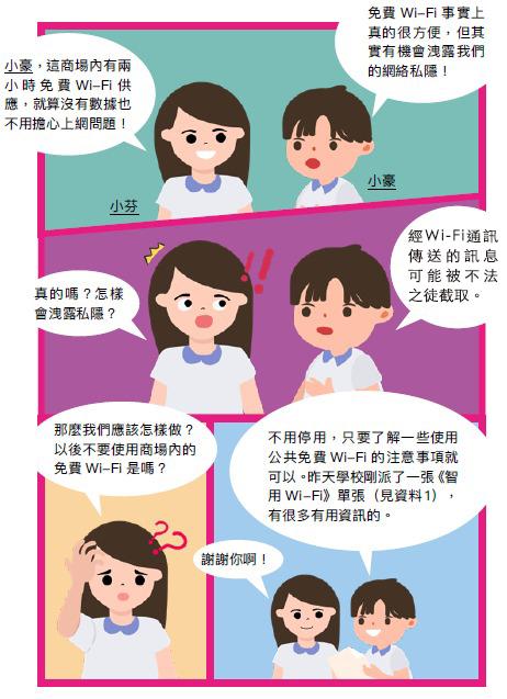 ★ 很多本地及海外公眾場所(例如商場、咖啡店、酒店或政府場地等)都會提供免費Wi-Fi上網設施。用戶使用Wi-Fi服務時,須注意相關保安風險。★ 不小心將流動裝置連接至黑客裝設或被黑客入侵的Wi-Fi網絡,用戶可能因而按下連接至欺詐或附有惡意程式網站的連結,導致帳戶、個人資料外洩。