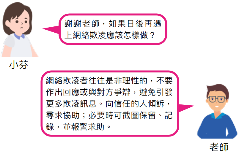 (2)接續學習活動(1),透過老師與小芬的對話,了解若遇上網絡欺凌應如何處理。