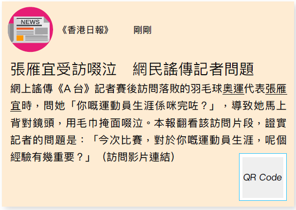 (1)比較以下3 則新聞的標題、內文及報道手法,學習分辨負責任的新聞報道方式。(註:以下資料按新聞事件改寫,並因應教學需要有所修改。)