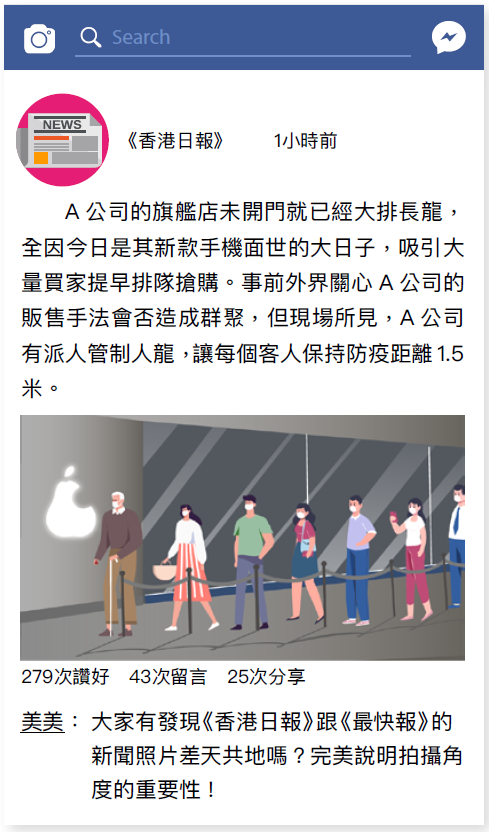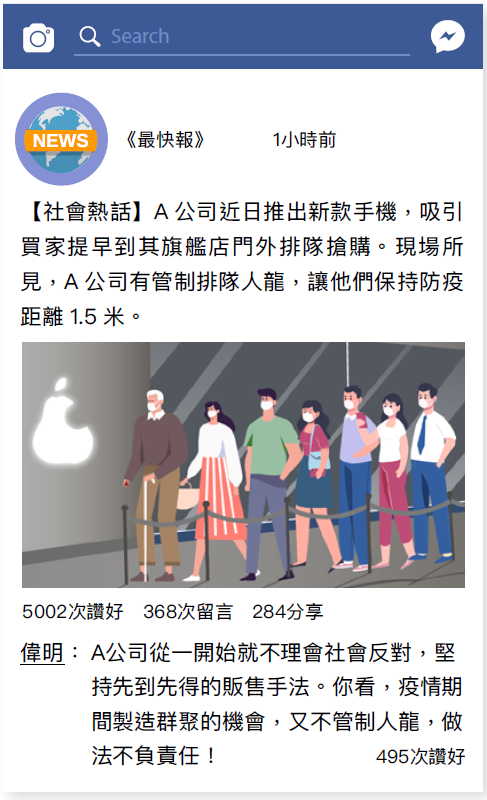 6. (i)配合社會對A公司販售手法的關注,吸引讚好;(ii)大眾被誤導, 以為A公司沒有管制人龍;(iii)社會對A公司無視疫情及群聚的販售手段反感
