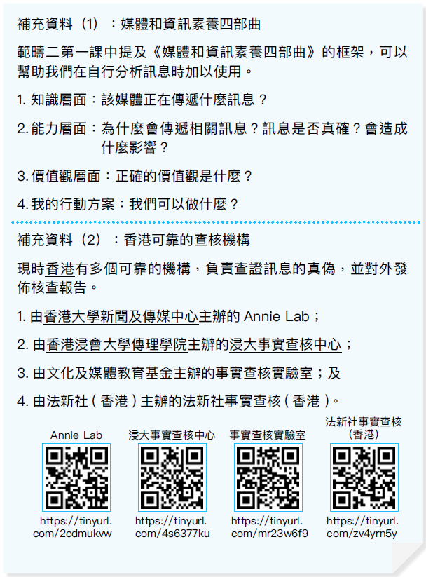 ★ 善用媒體提供的大量訊息前,要先懂得評估過濾。除熱身活動提及的準確性及關聯性外,還要檢視訊息的可信度、有效性,以及傳播者的身分。