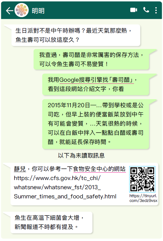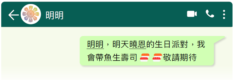 靜兒打算為曉恩的生日派對準備壽司。閱讀她與明明的WhatsApp 對話,然後回答問題。