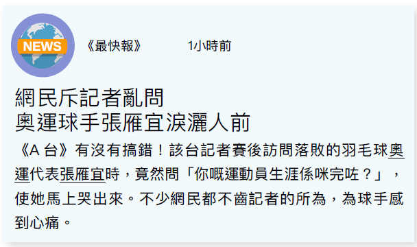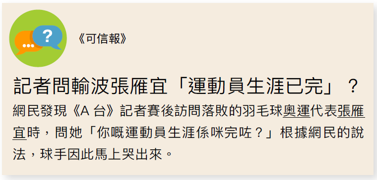 1. 在羽毛球奧運代表張雁宜落敗後,問她「你嘅運動員生涯係咪完咗」,導致球手落淚。
