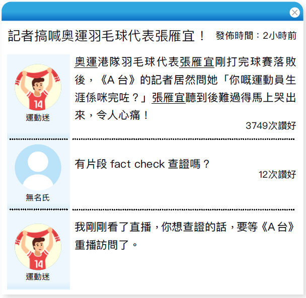 6. 不會。儘管《可信報》在標題加上問號,又強調訊息引述自網民,但它沒有利用訪問片段查證指控的真偽,為《A台》闢謠,傳播正確的訊息,反而協助網民散播虛假訊息。