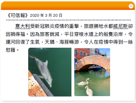 1. 意大利受新冠肺炎疫情的重擊,但威尼斯的運河卻因而回復了生氣,天鵝、海豚暢游。