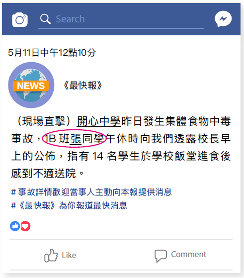 陳校長:本校昨日開始出現集體食物中毒事故,截至目前共有14 名同學送院治理。暫時引起事故的起因不明,但學校飯堂會由即日起停止向外供應食物,直至校內調查結束。同學最近如感到不適,記得儘快求醫及向老師報告。