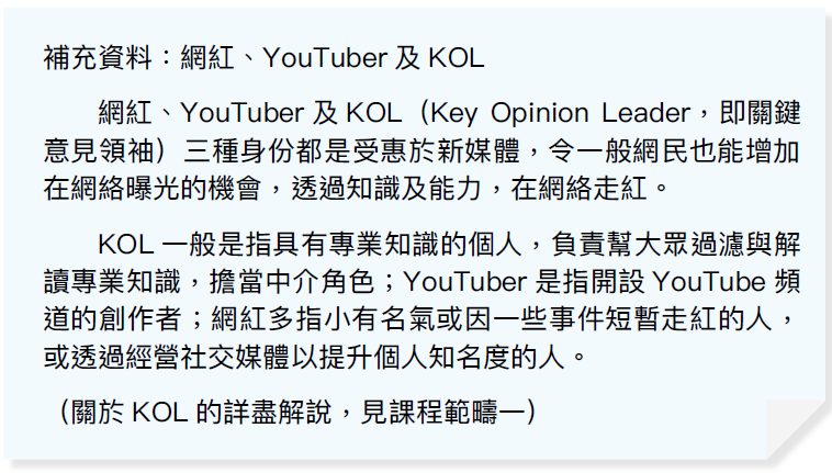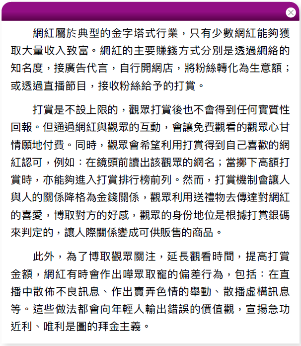 (1)透過閱讀資料,認識網紅的收入方式,分析打賞機制會帶來的問題,判斷哪些是有問題的招徠手段。