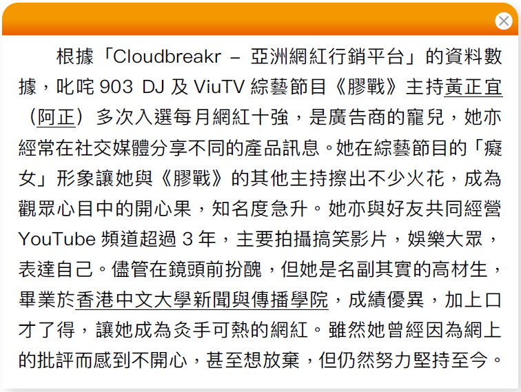 ★ 例如:DJ 黃正宜本身學業成績優異、口才了得,既是電台及綜藝節目主持,亦與朋友共同經營YouTube 頻道,身兼多職,加上願意為娛樂觀眾扮醜,都讓她成為成功的網紅。