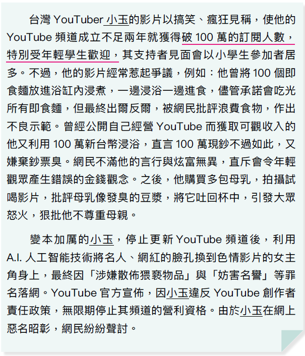 (1)透過台灣YouTuber 小玉的例子,明白在網絡世界的言行必須考慮對個人及社會帶來的影響,顧及他人的感受。