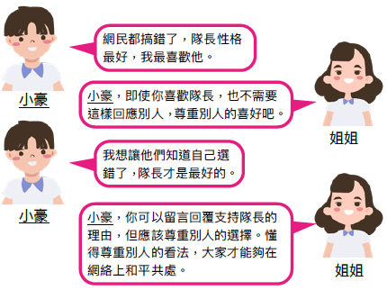 (1)透過小豪在網上討論區的回應,以及他跟姐姐的對話,明白每個人的喜好不同,要學懂尊重別人。